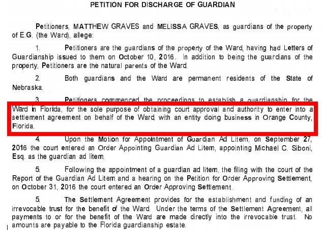 However, let’s try to read between the lines. Disney is an entity doing business in Orange County, Florida. And the only purpose for setting up a guardianship was for obtaining court approval is of the settlement for the sister’s claim.